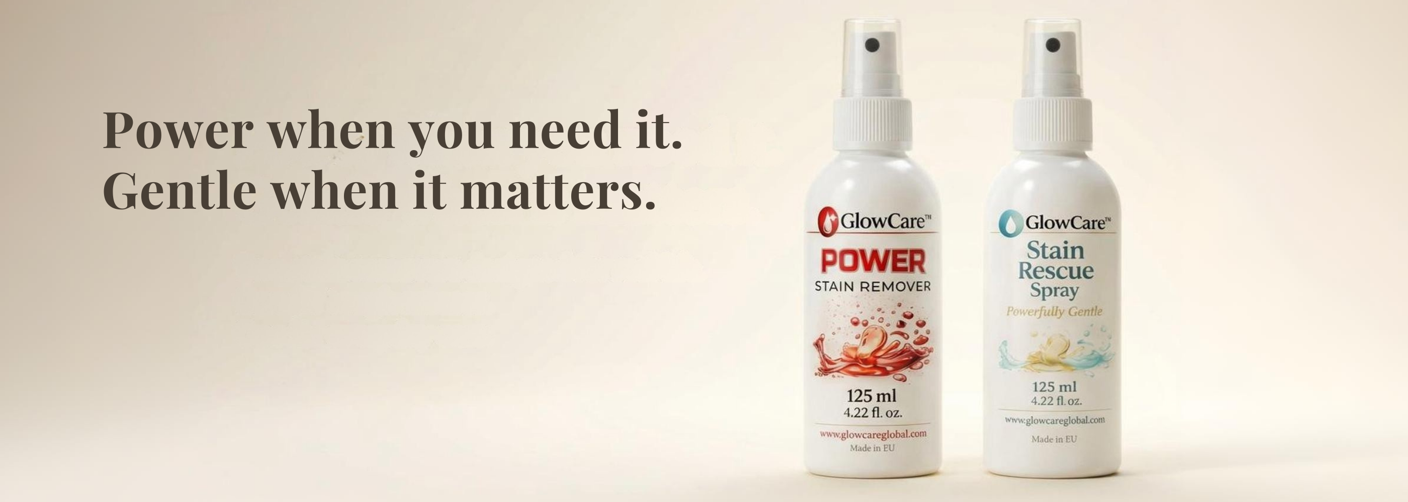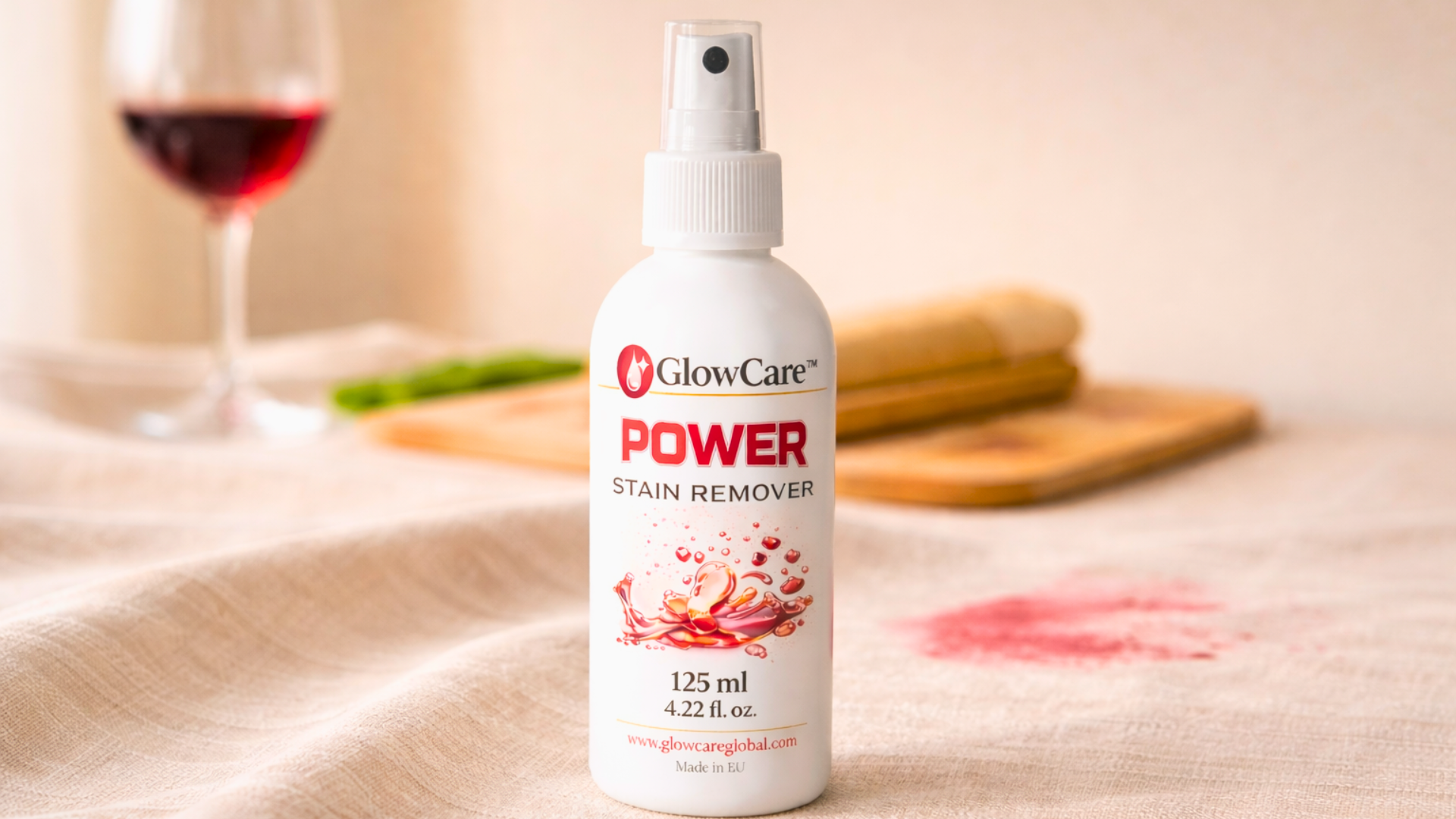 GlowCare Power is designed for tougher, set-in stains like red wine, sauces, grease, and food spills.